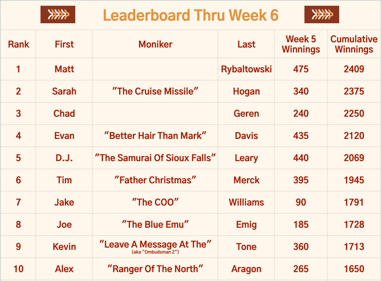 475 points is, after all, larger than any other Week 6 winnings on the screen. Downtown Tyler Brown, however, posted a 515-piece, in part thanks to being one of the very few who took Xander outright. Tyler is so far downtown that in spite of his massive week he's still out of the top 10 of a 17-person race.